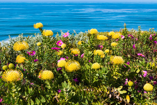 Protea Pincushion High Gold Leucospermum Cordifolium Flowers Growing In A Garden With A Background Of Blue Ocean Water Stock Photo Adobe Stock